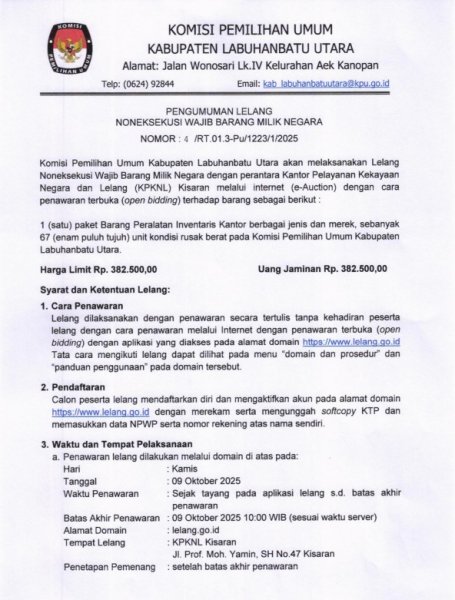 Berikut kami sampaikan Pengumuman lelang Noneksekusi Wajib Barang Milik Negara Nomor: 4/RT.01.3-Pu/1223/1/2025 Bahwasannya Komisi Pemilihan Umum Kabupaten Labuhanbatu Utara akan melaksanakan Lelang Noneksekusi Wajib Barang Milik Negara dengan perantara Kantor Pelayanan Kekayaan Negara dan Lelang (KPKNL) Kisaran melalui internet (e-auction) dengan cara penawaran terbuka (open bidding) terhadap barang... BACA_SELENGKPANYA.pdf ....