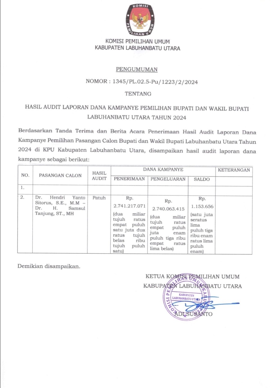 PENGUMUMAN HASIL AUDIT LAPORAN DANA KAMPANYE PEMILIHAN BUPATI DAN WAKIL BUPATI LABUHANBATU UTARA TAHUN 2024