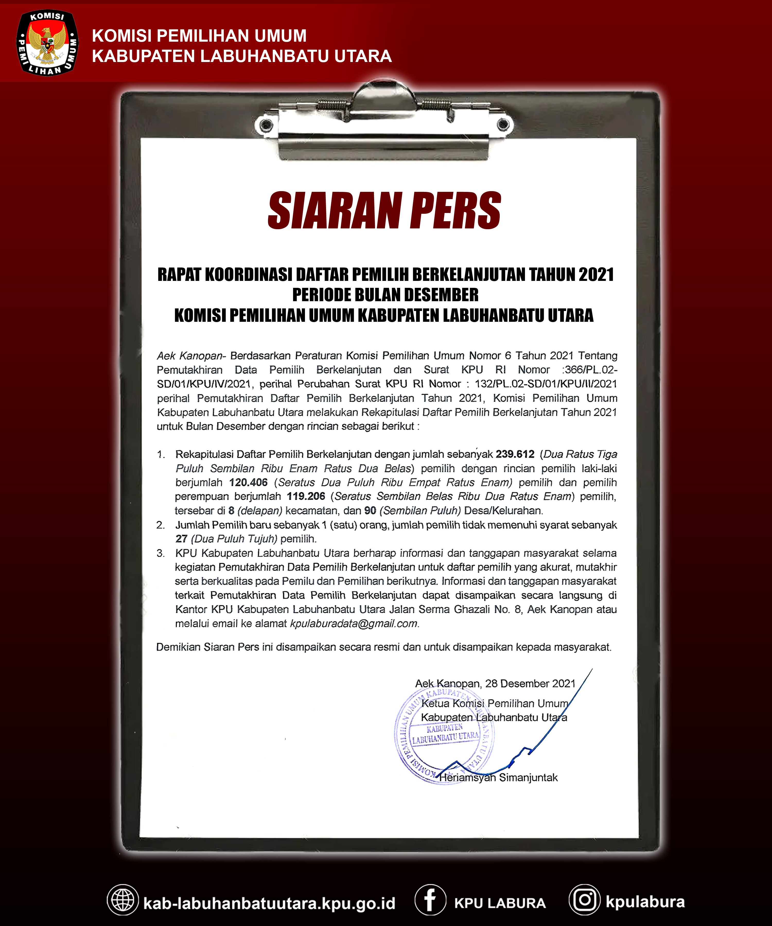 Dalam rapat koordinasi tersebut, KPU Kabupaten Labuhanbatu Utara menetapkan Rekapitulasi Hasil Pemutakhiran Daftar Pemilih Berkelanjutan pada periode bulan Desember Tahun 2021 dengan jumlah sebanyak 239.612 pemilih dengan rincian pemilih laki-laki berjumlah 120.406 pemilih dan pemilih perempuan berjumlah 119.206 pemilih yang tersebar di 8 kecamatan dan 90 Desa/Kelurahan. Dalam rapat koordinasi tersebut, KPU Kabupaten Labuhanbatu Utara juga menetapkan Jumlah Pemilih Baru sebanyak 1 pemilih, jumlah pemilih tidak memenuhi syarat sebanyak 27 pemilih.