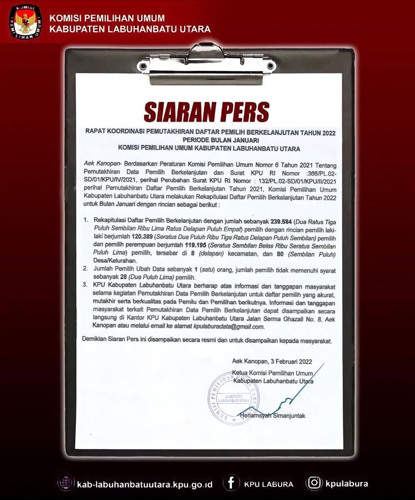 Dalam Rapat Koordinasi tersebut, KPU Kabupaten Labuhanbatu Utara menetapkan Rekapitulasi Hasil Pemutakhiran Daftar Pemilih Berkelanjutan pada periode bulan Januari 2022 dengan Jumlah sebanyak 239.584 Pemilih dengan rincian Pemilih Laki-laki berjumlah 120.389 dan Pemilih Perempuan berjumlah 119.195 pemilih yang tersebar di 8 kecamatan dan 90 Desa/Kelurahan. Dalam rapat koordinasi tersebut, KPU Kabupaten Labuhanbatu Utara juga menetapkan Jumlah Pemilih ubah data sebanyak 1 pemilih, jumlah pemilih tidak memenuhi syarat sebanyak 28 pemilih.
