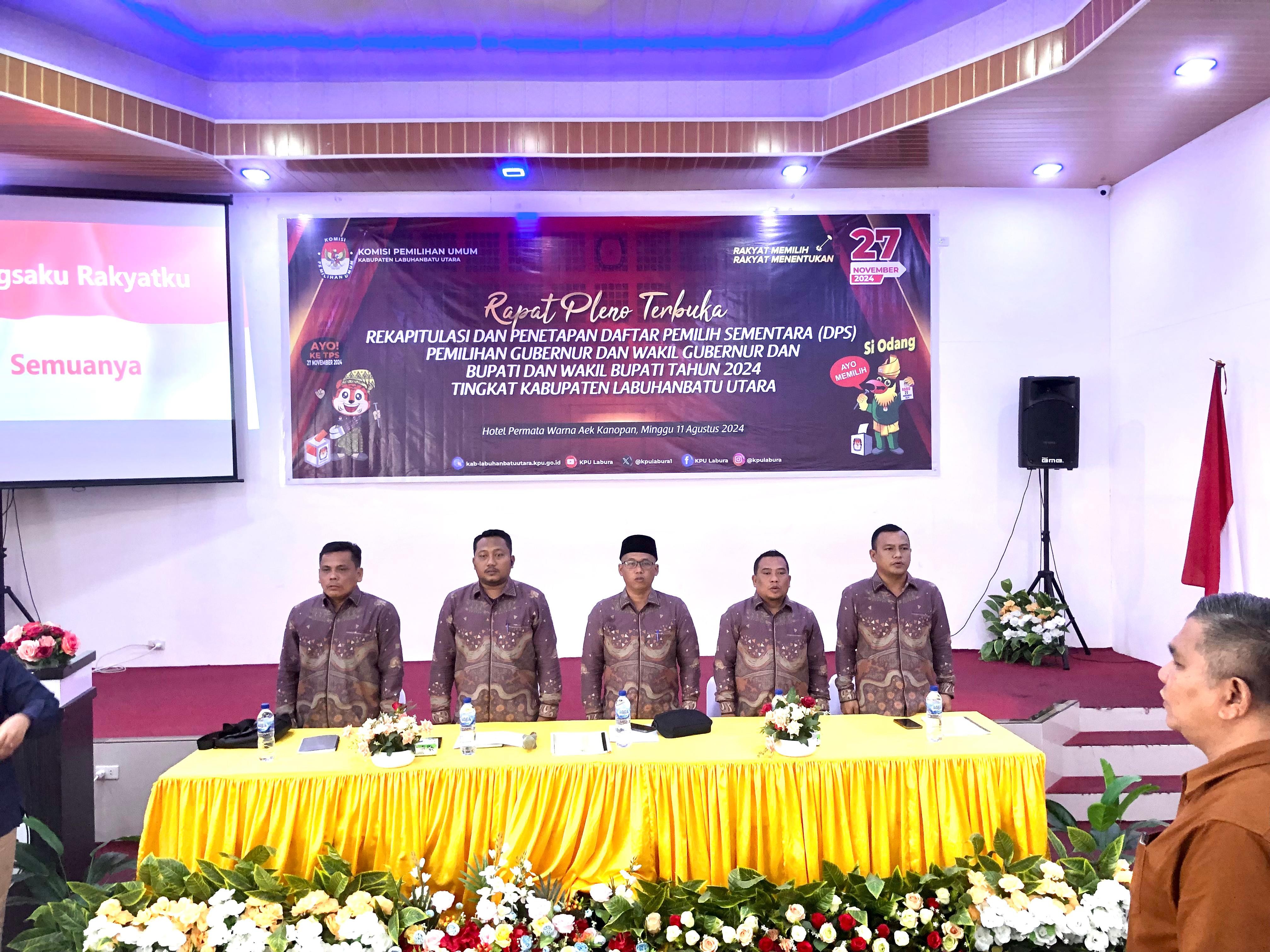 Dalam Rapat Pleno tersebut ditetapkan Daftar Pemilih Sementara (DPS) Tingkat Kabupaten Labuhanbatu Utara pada Pilkada Serentak Tahun 2024 berjumlah 273.667 pemilih, dengan rincian 137.022 pemilih laki-laki dan 136.645 pemilih perempuan yang tersebar di 748 TPS pada 8 Kecamatan Se-Kabupaten Labuhanbatu Utara.