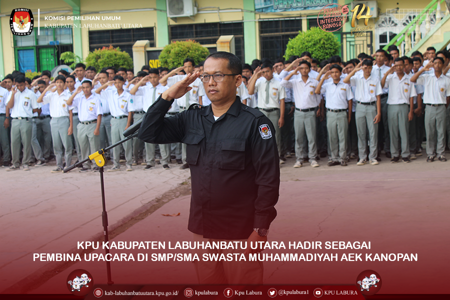 Aek Kanopan,- Komisi Pemilihan Umum Kabupaten Labuhanbatu Utara melaksanakan Sosialisasi Pendidikan Pemilih kepada siswa-siswi SMP/SMA Swasta Muhammadiyah, Aek Kanopan, Kabupaten Labuhanbatu Utara dengan hadir sebagai Pembina Upacara di Komplek Perguruan SMP dan SMK Muhammadiyah Aek Kanopan pada Senin,(15/1).