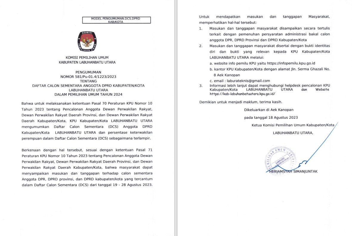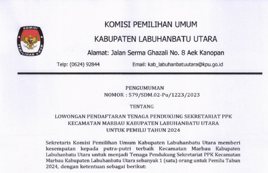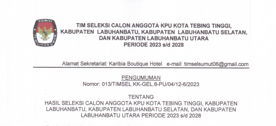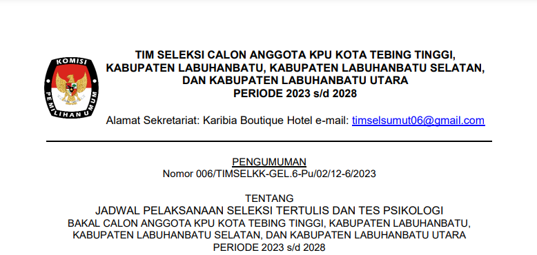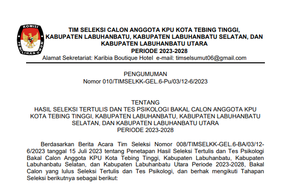 #TemanPemilih, berikut kami sampaikan Pengumuman Timsel Anggota KPU Provinsi Sumatera Utara Nomor. 010/TIMSELKK-GEL.6-Pu/03/12-6/2023 tentang Hasil Seleksi Tertulis dan Psikologi Bakal Calon Anggota KPU Kota Tebing Tinggi, Kabupaten Labuhanbatu, Kabupaten Labuhanbatu Selatan, dan Kabupaten Labuhanbatu Utara periode 2023-2028.
