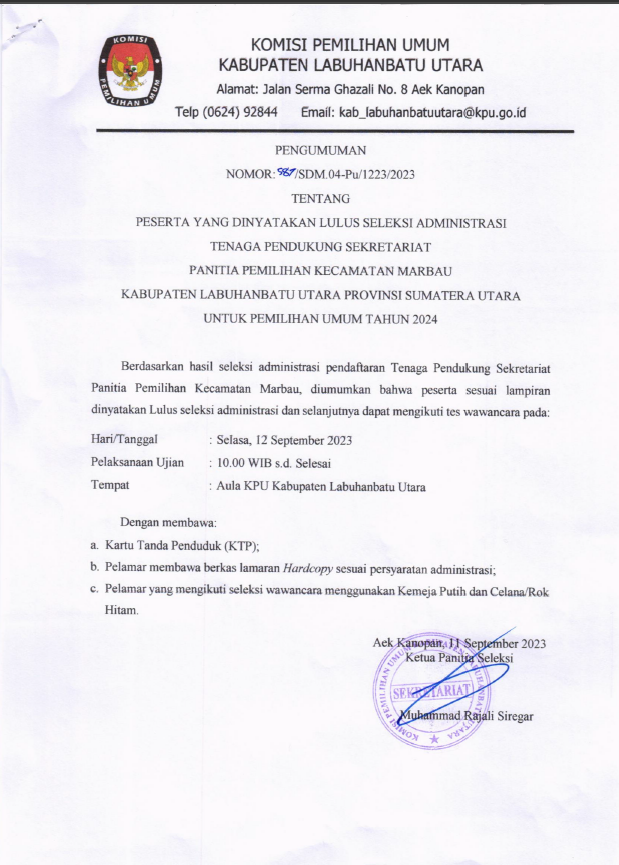 Untuk Melihat nama-nama peserta yang lulus dan Informasi lebih lanjut mengenai seleksi Calon Anggota KPU Kabupaten Labuhanbatu Utara periode 2023-2028 silahkan dilihat pada link berikut ini: