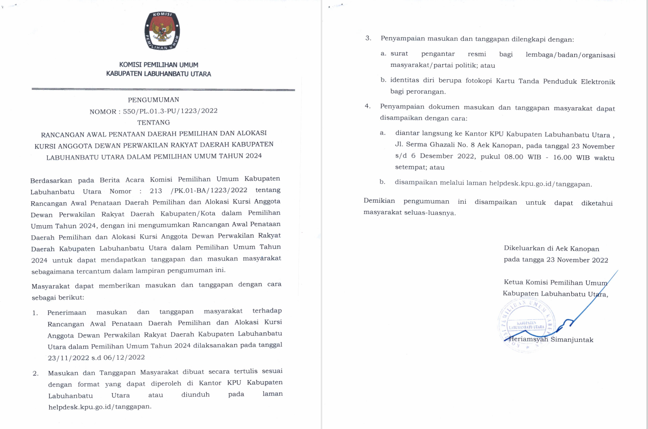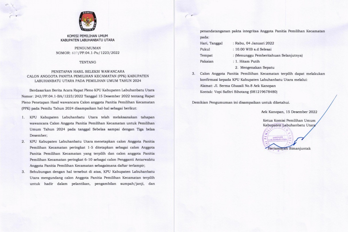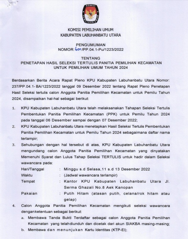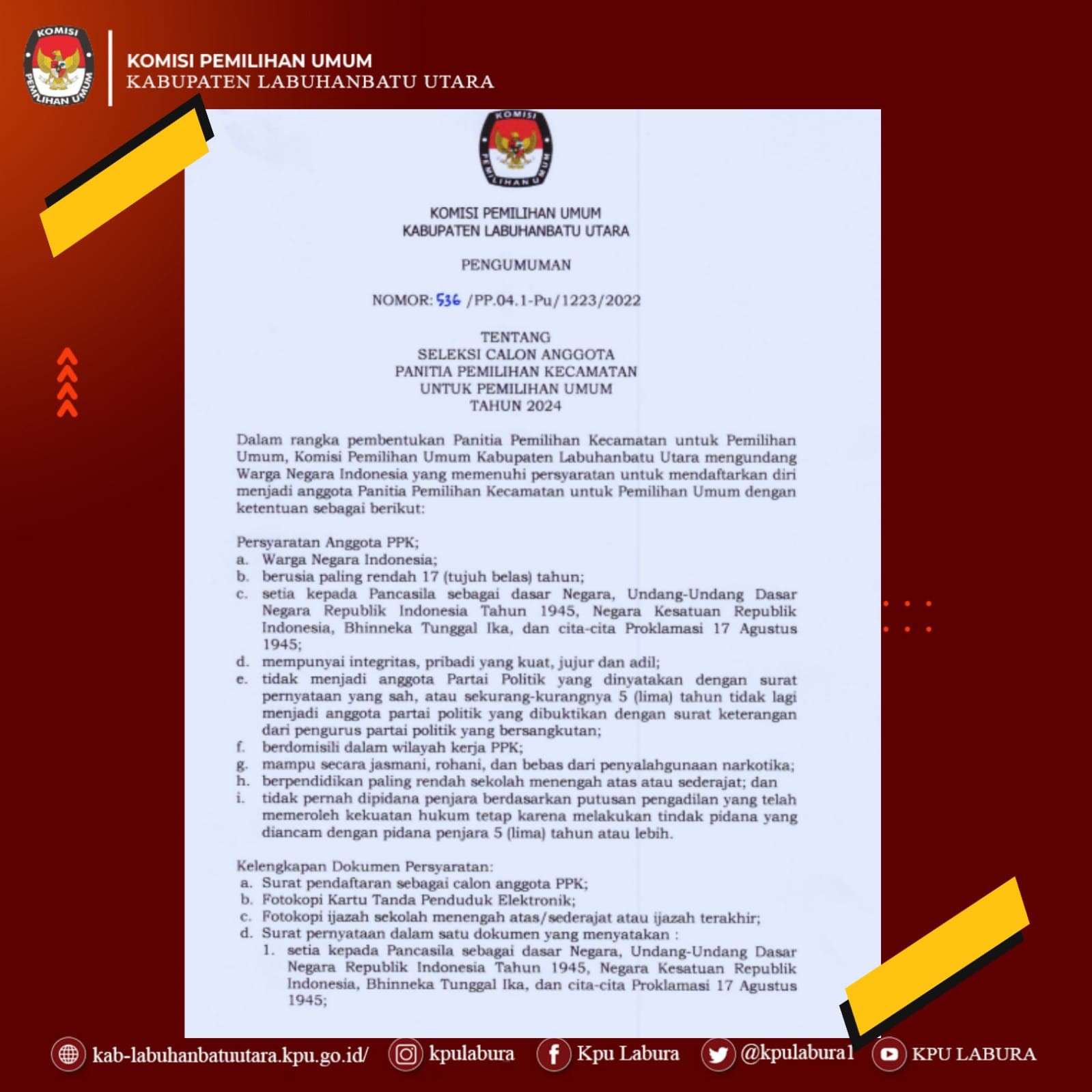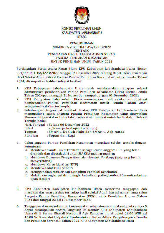 #Temanpemilih, Pengumuman Komisi Pemilihan Umum Kabupaten Labuhanbatu Utara tentang Penetapan Hasil Seleksi Administrasi Calon Anggota Panitia Pemilihan Kecamatan (PPK) untuk Pemilu Tahun 2024 dan jadwal seleksi Ujian tertulis (CAT).
