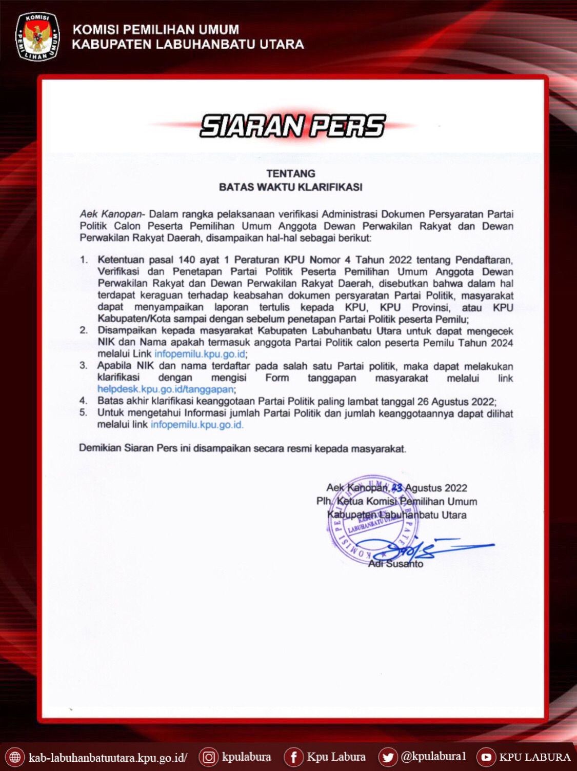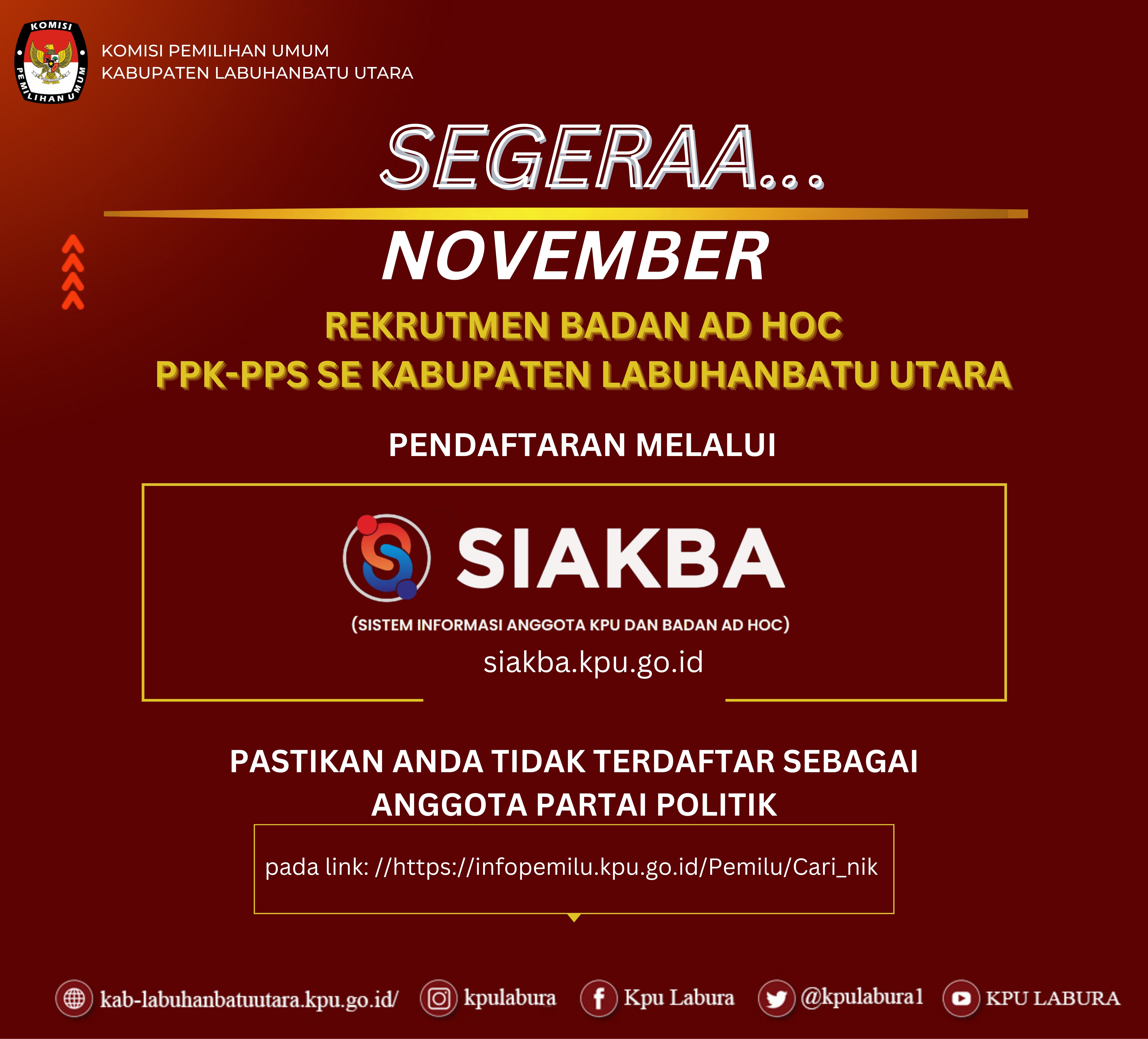 Pendaftaran Penyelenggara badan Adhoc Pemilu 2024 akan dilakukan secara online menggunakan aplikasi SIAKBA (Sistem Informasi Anggota KPU dan Badan Adhok) yang akan dimulai pada pertengahan November 2022 mendatang.