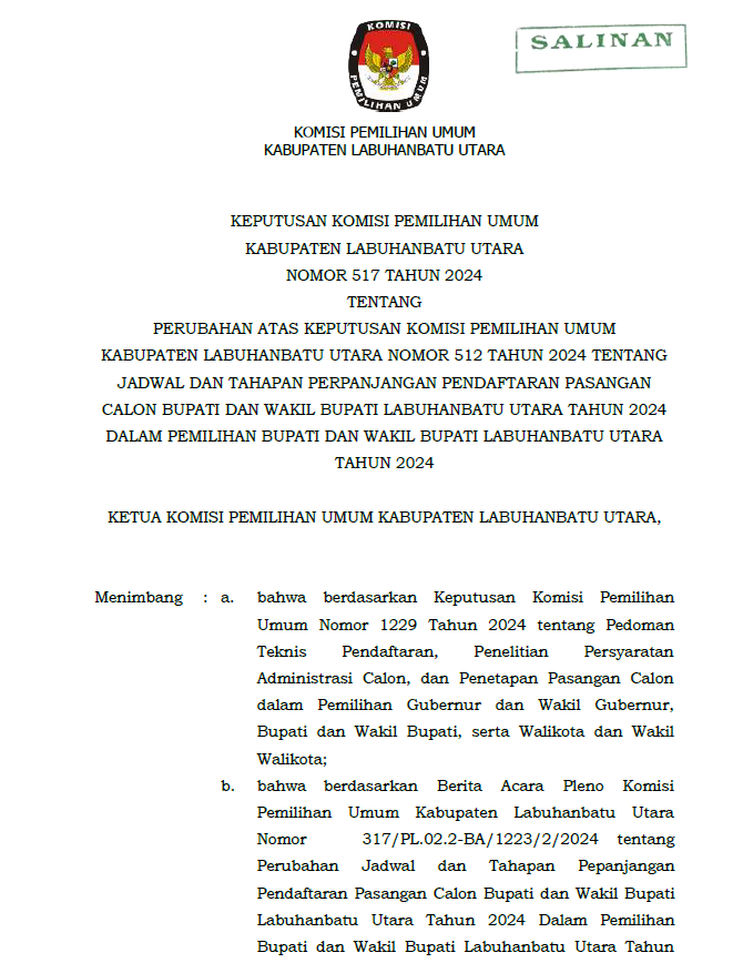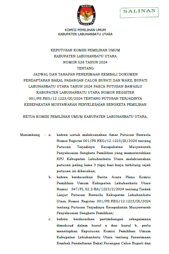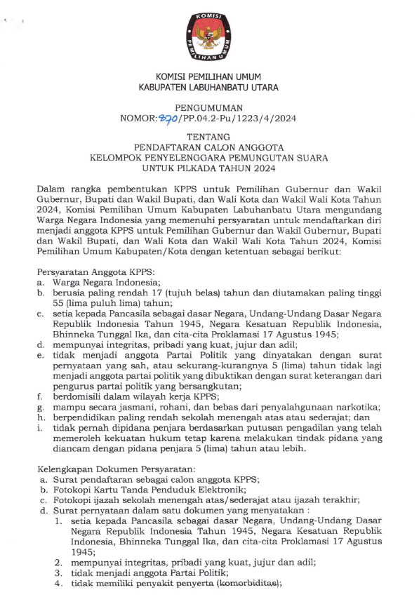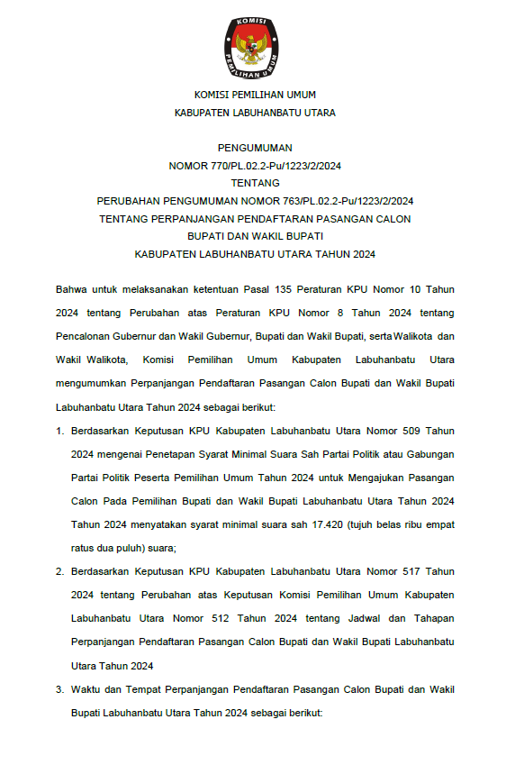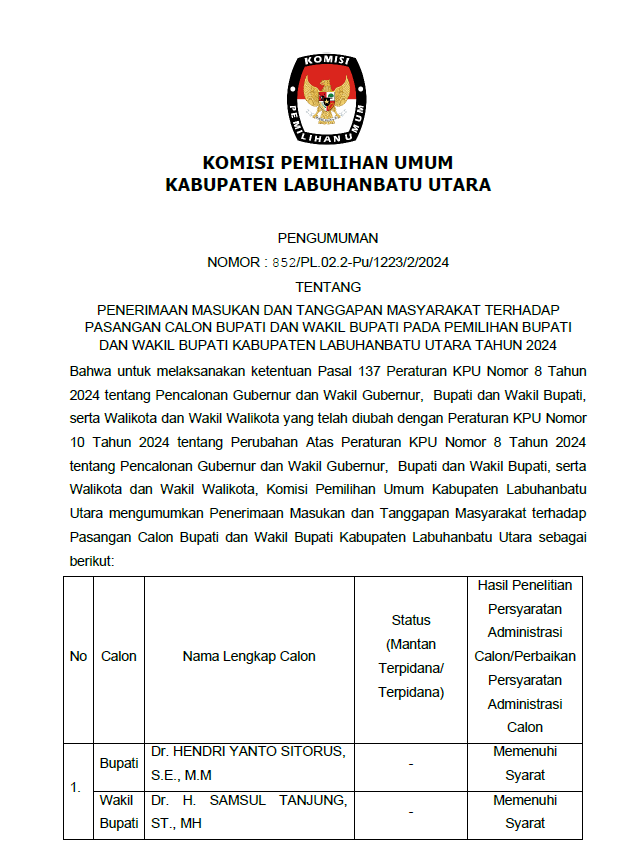 Berikut kami sampaikan Pengumuman KPU Kabupaten Labuhanbatu Utara Nomor 825/PL.02.2-Pu/1223/2/2024 tentang Penerimaan Masukan dan Tanggapan Masyarakat terhadap Pasangan Calon Bupati dan Wakil Bupati pada Pemilihan Bupati dan Wakil Bupati Kabupaten Labuhanbatu Utara Tahun 2024.