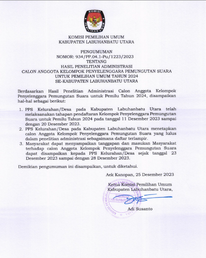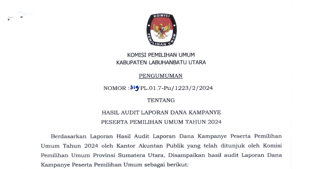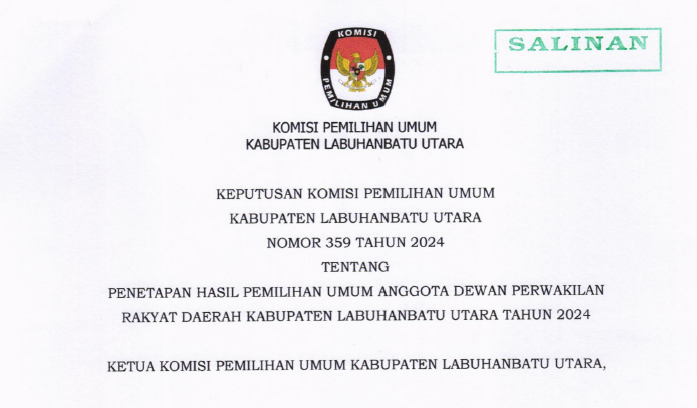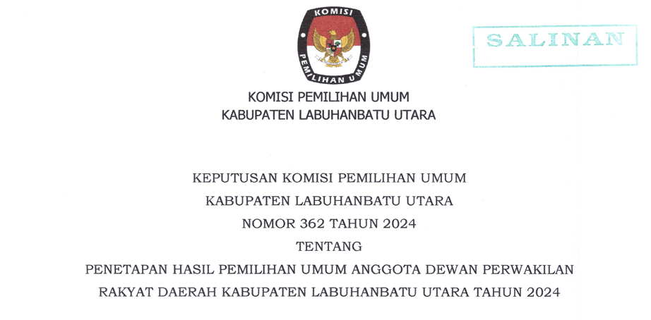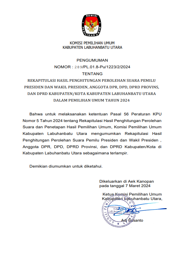 Berikut kami sampaikan Rekapitulasi Hasil Penghitungan Perolehan Suara Pemilu Presiden dan Wakil Presiden, Anggota DPR, DPD, DPRD Provinsi, dan DPRD Kabupaten/Kota di Kabupaten Labuhanbatu Utara dalam Pemilihan Umum Tahun 2024